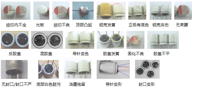 直插式電容頂部字符缺陷、頂部正負(fù)極方向缺陷及正負(fù)極印刷質(zhì)量檢測(cè)。