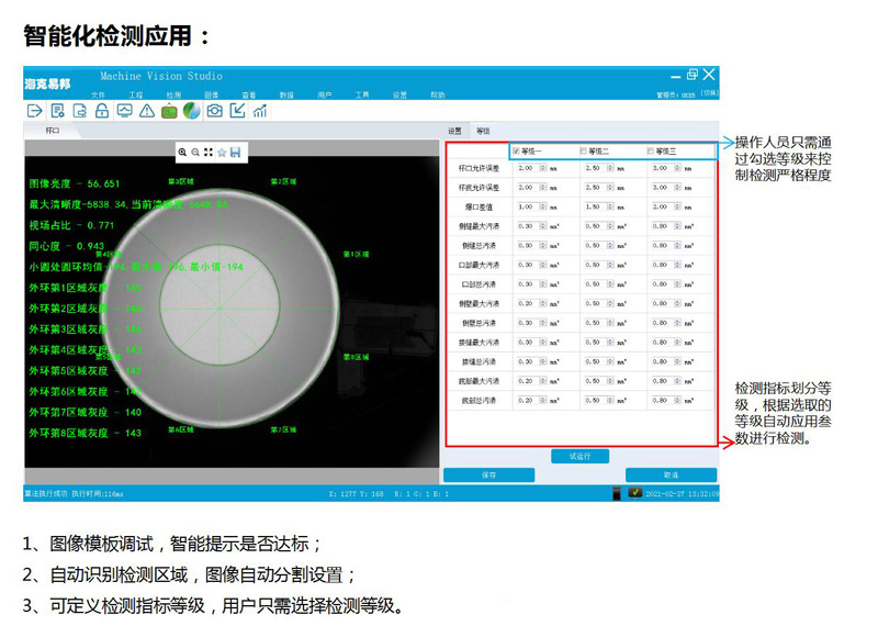 1.產品自動定位:檢測時實時定位商標特定圖案,給出當前位置的初始位置的偏差,檢測區域位置自動補償,實現產品自動定位功能。